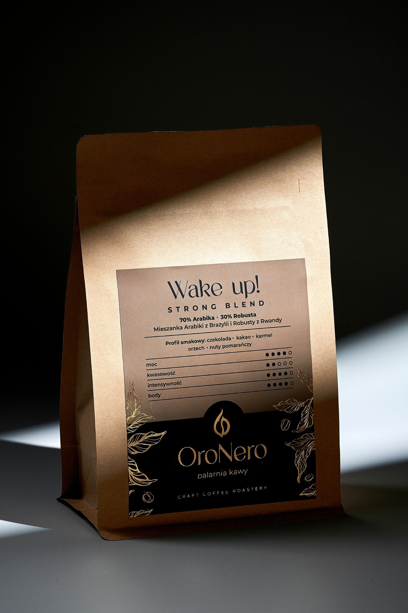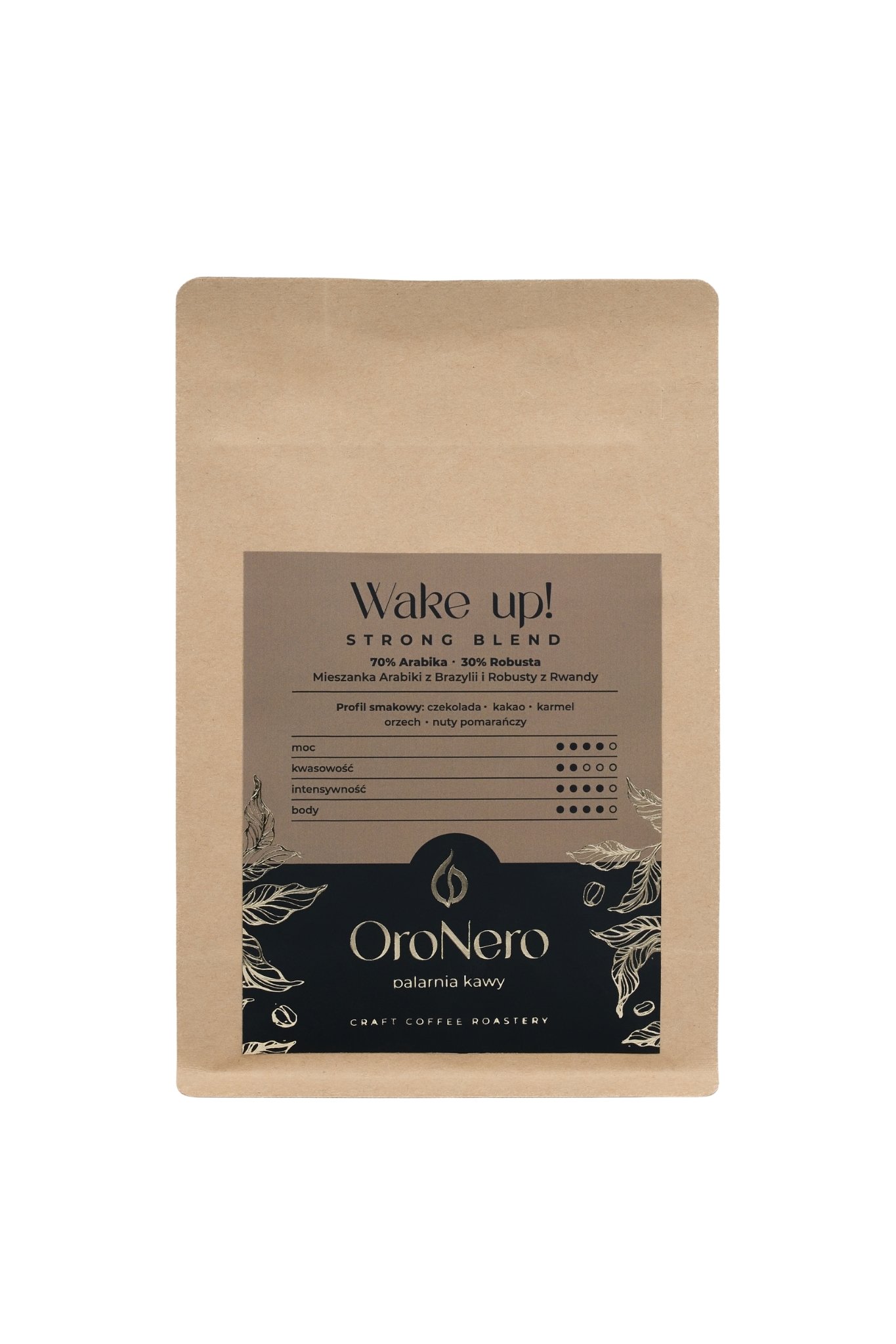 Wake Up! Strong Blend to kawa stworzona z myślą o tych, którzy potrzebują solidnego pobudzenia i intensywnego smaku z samego rana. Mieszanka charakteryzuje się mocnym, wyrazistym profilem z dominującymi nutami gorzkiej czekolady, orzecha i lekką goryczką typową dla ciemniejszego palenia. Ma niską kwasowość, pełne body i trwały, energetyzujący finisz. Idealna do espresso i kaw mlecznych – skutecznie budzi i daje porządny zastrzyk energii. Dla miłośników klasycznych, mocnych kaw bez kompromisów.